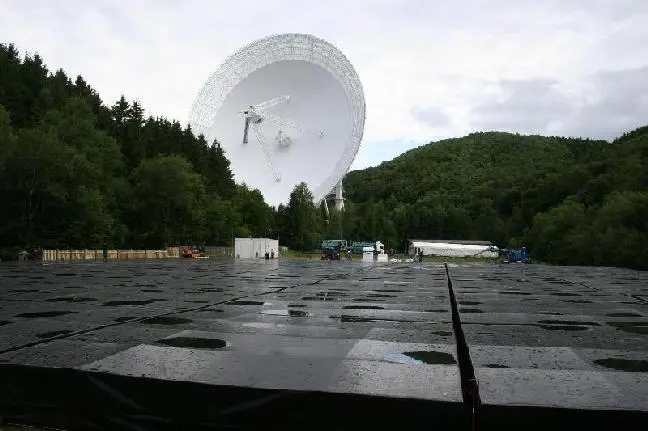 Das Foto zeigt, dass das hochfrequente Antennenfeld (vorne im Bild) aus 96 Styroporkästen von etwa 5 x 5 m Größe besteht, in die Metallplatten eingelassen und die mit stabiler Plastikfolie abgedeckt sind. © MPIfR, J. Anderson