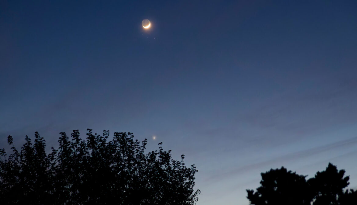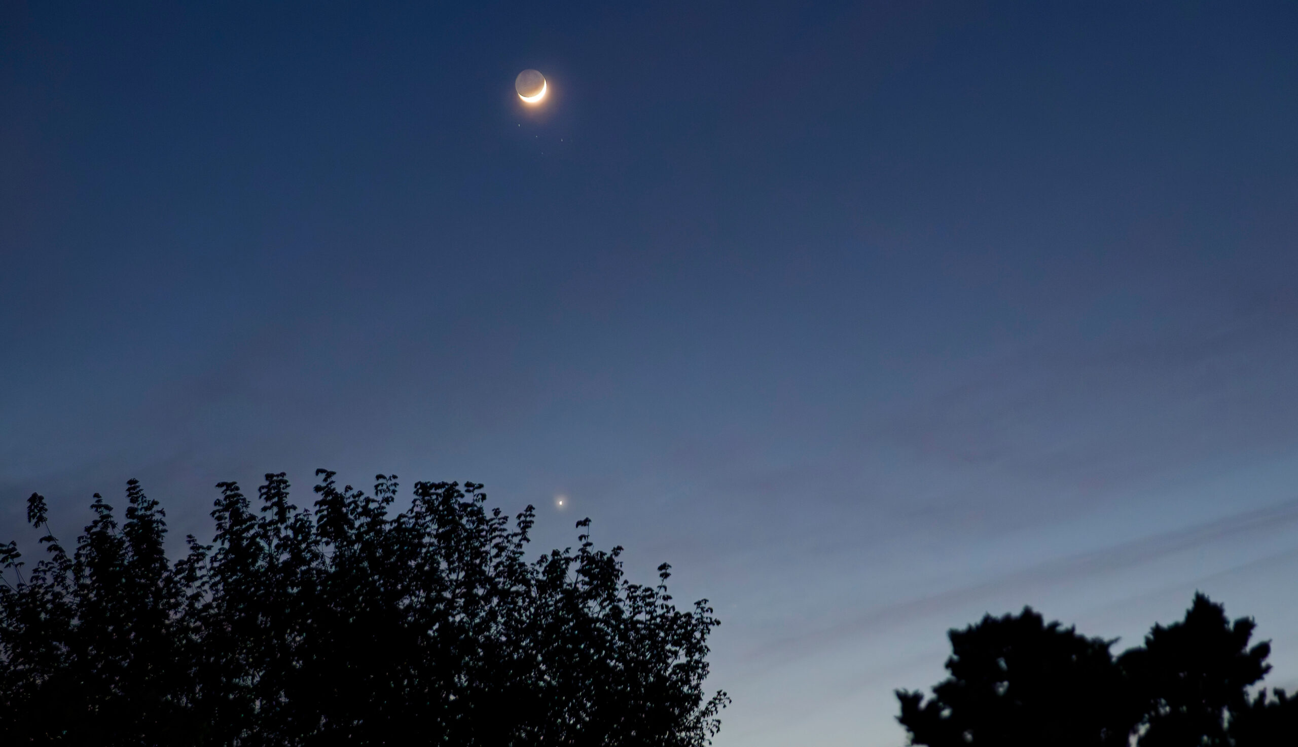 Es zeigt den Mond und die Venus. Unterhalb der schmalen Mondsichel sind zudem Sterne der Plejaden zu erkennen.